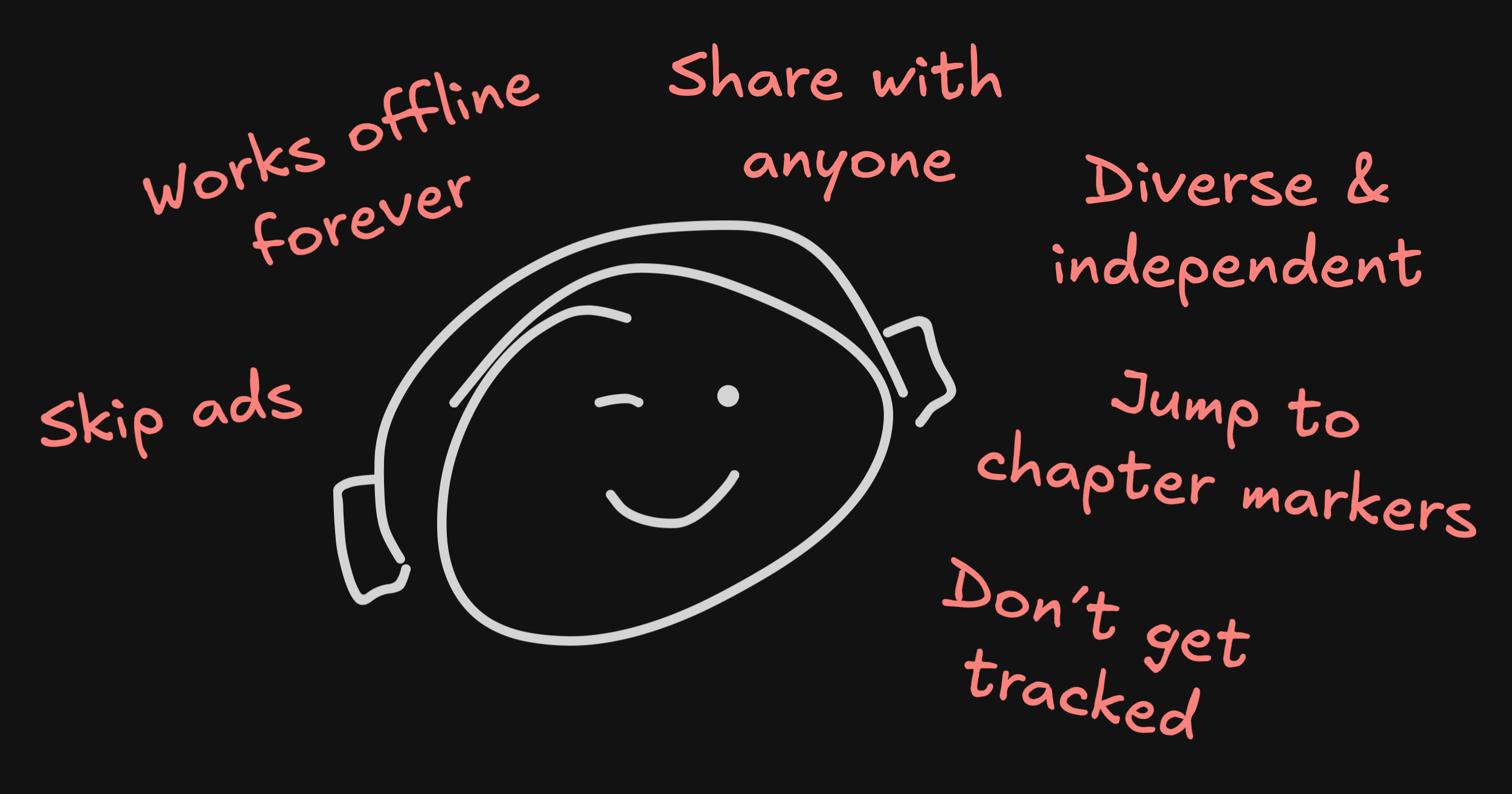 Imagine a world in which you download a podcast episode and it’s just an audio file that you can save anywhere and play at any time. You can collect your favorite episodes and listen to them even without internet, long after any Spotify or Apple are gone.